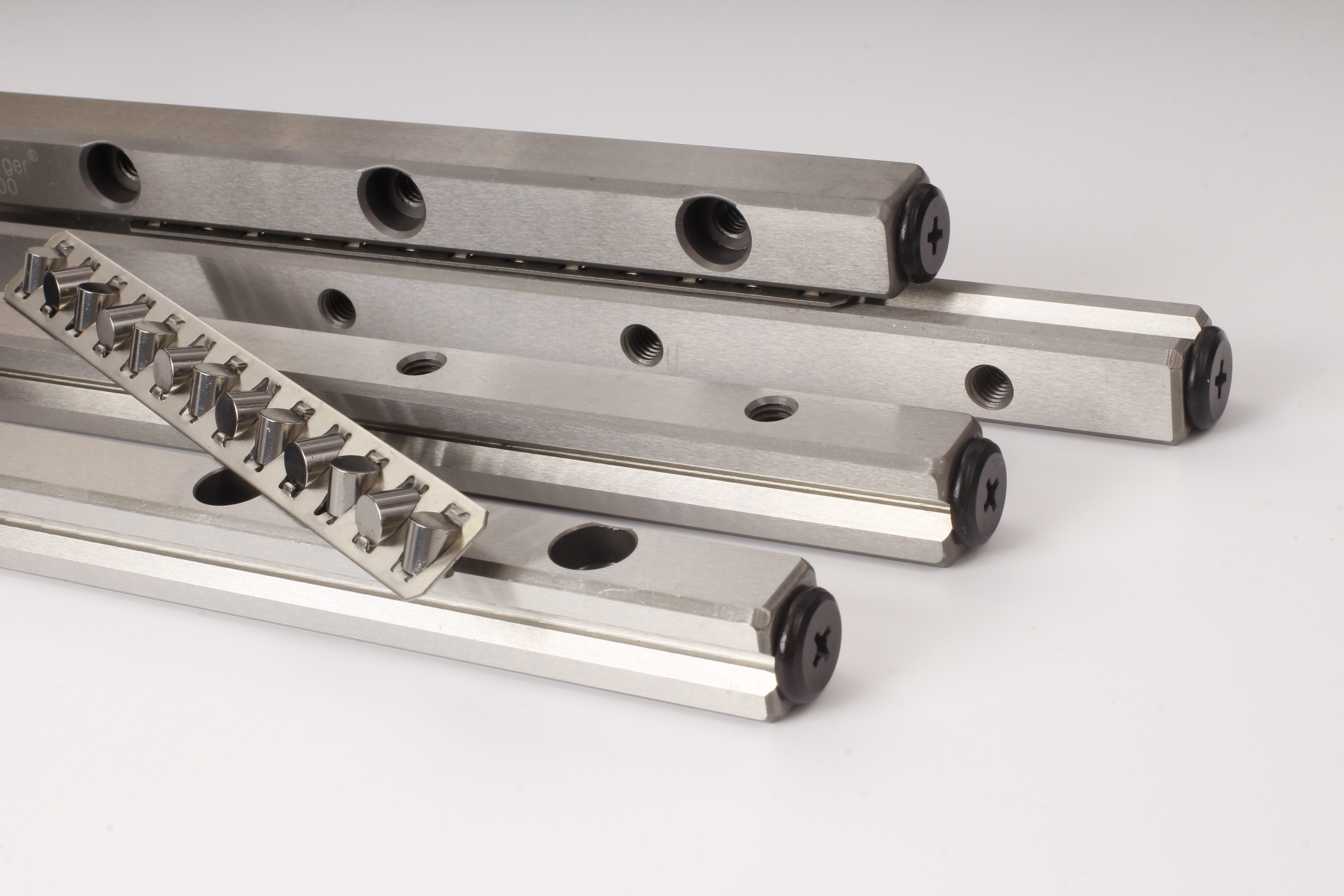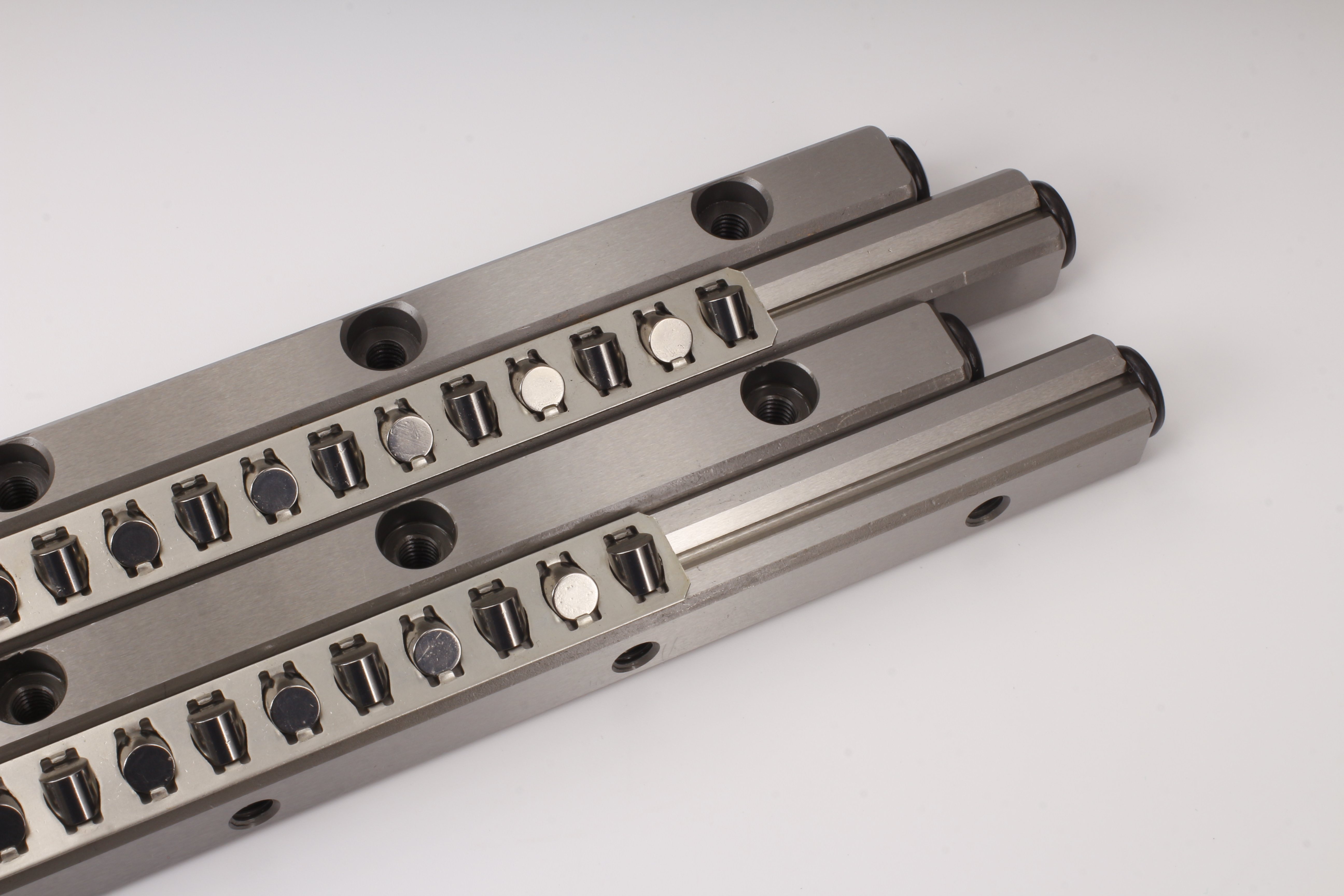滾柱交叉導(dǎo)軌是一種由導(dǎo)軌、滾柱和保持架組成的導(dǎo)軌系統(tǒng)。在此系統(tǒng)中,滾柱相互交錯(cuò)排列,形成了一種獨(dú)特的支撐結(jié)構(gòu)。導(dǎo)軌一般采用高強(qiáng)度鋼材制成,以提高其承載能力和耐磨性;保持架則是用來(lái)固定滾柱,不讓滾柱出現(xiàn)位移,是實(shí)現(xiàn)穩(wěn)定運(yùn)動(dòng)的組件,具備良好的平穩(wěn)性和低摩擦性。
