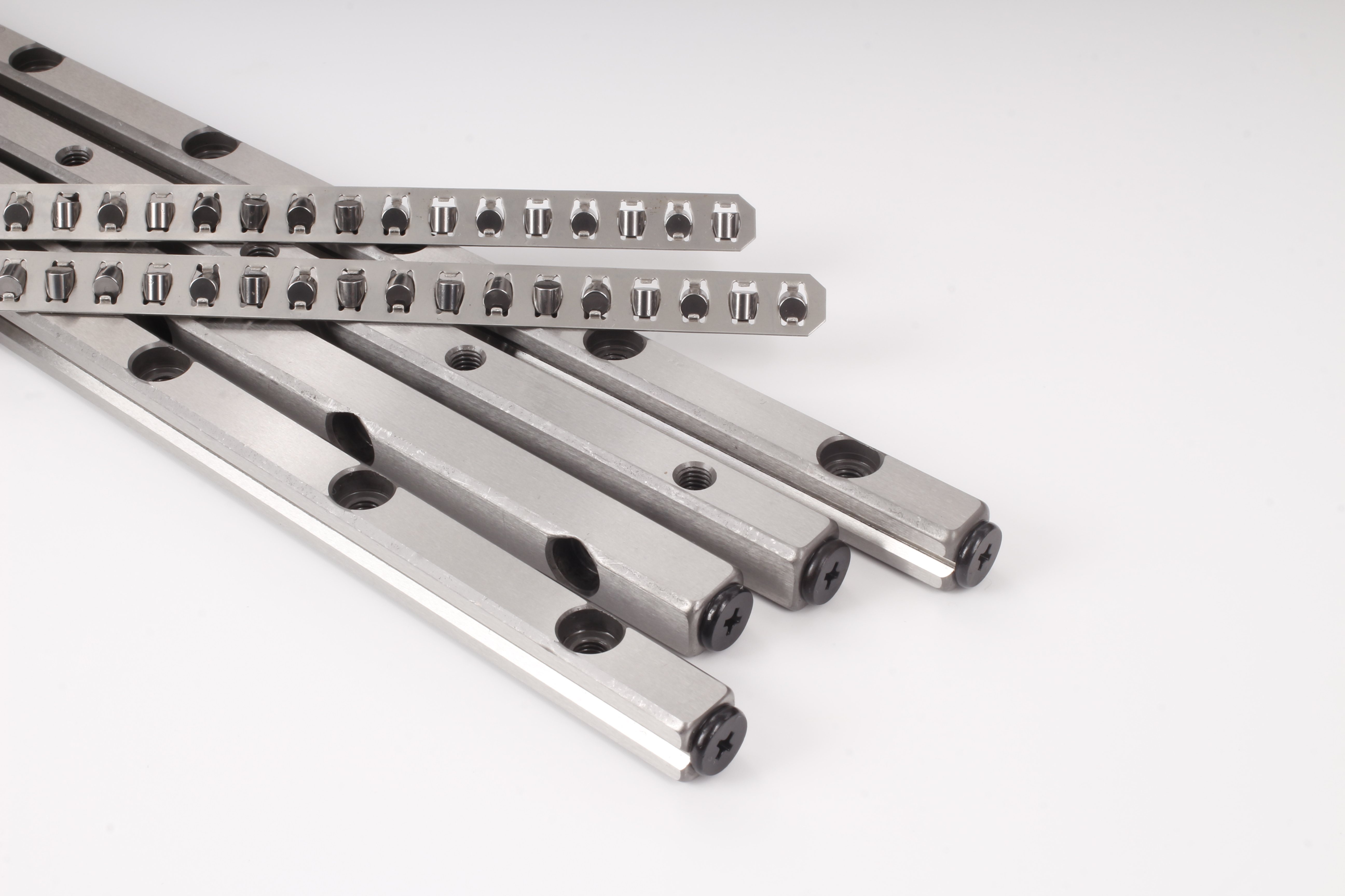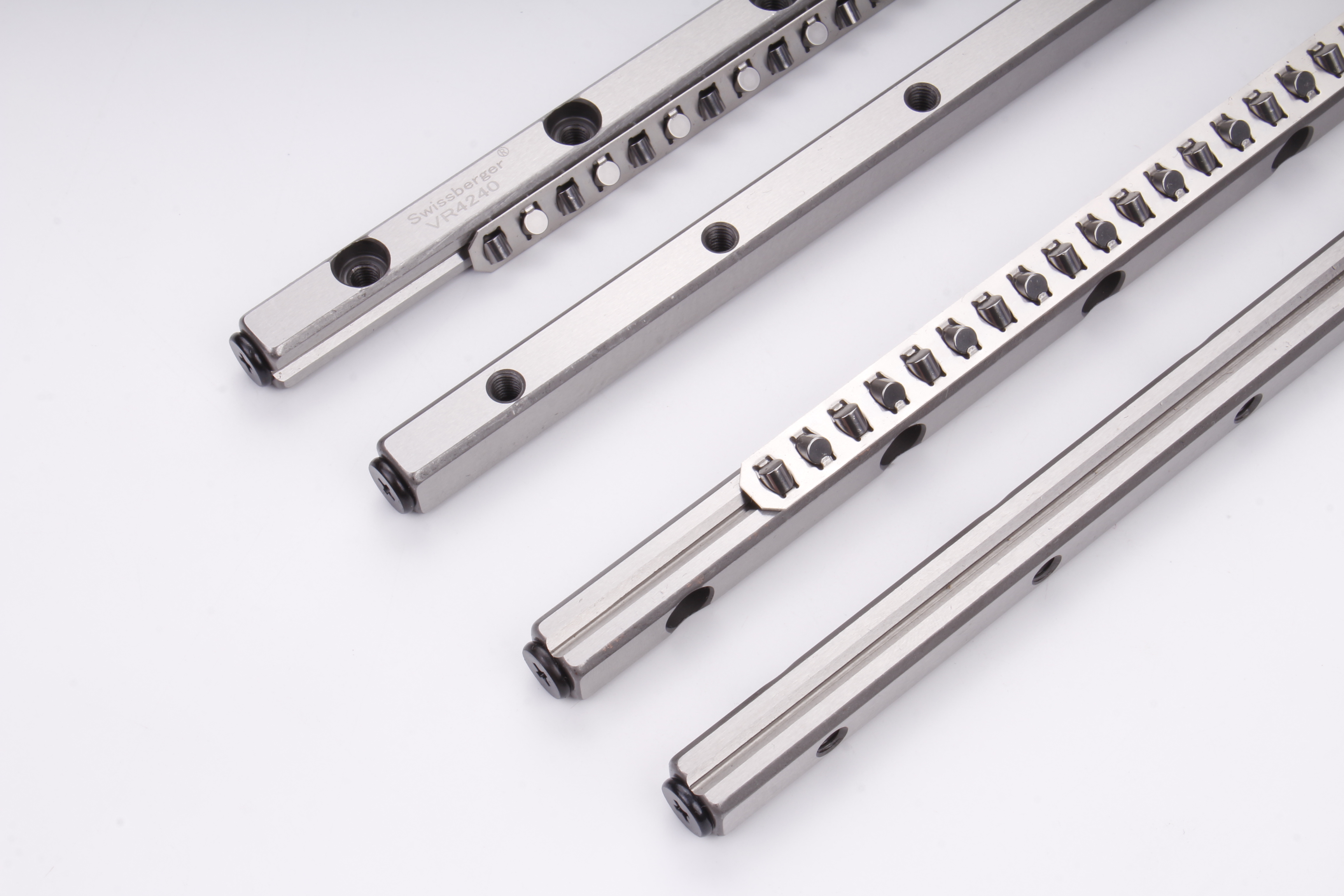 它主要由導(dǎo)軌本體、交叉排列的圓柱滾子及保持架構(gòu)成,滾子以90°角相互交錯排布在V型滾道內(nèi),與導(dǎo)軌面形成緊密的線接觸。這種交叉結(jié)構(gòu)使?jié)L子均勻分散載荷,可同時承受徑向、反徑向及橫向力矩等多向載荷,相較于傳統(tǒng)滾珠導(dǎo)軌,接觸面積大幅增加,剛性與承載能力顯著提升。導(dǎo)軌本體多采用高強(qiáng)度合金鋼,經(jīng)精密磨削與特殊熱處理,搭配不銹鋼型號可選的設(shè)計,既能保證結(jié)構(gòu)緊湊耐用,又能適應(yīng)高濕度、高粉塵等復(fù)雜工業(yè)環(huán)境。保持架則精準(zhǔn)分隔滾子,優(yōu)化潤滑油留存,有效降低磨損,確保運動平滑無阻滯。